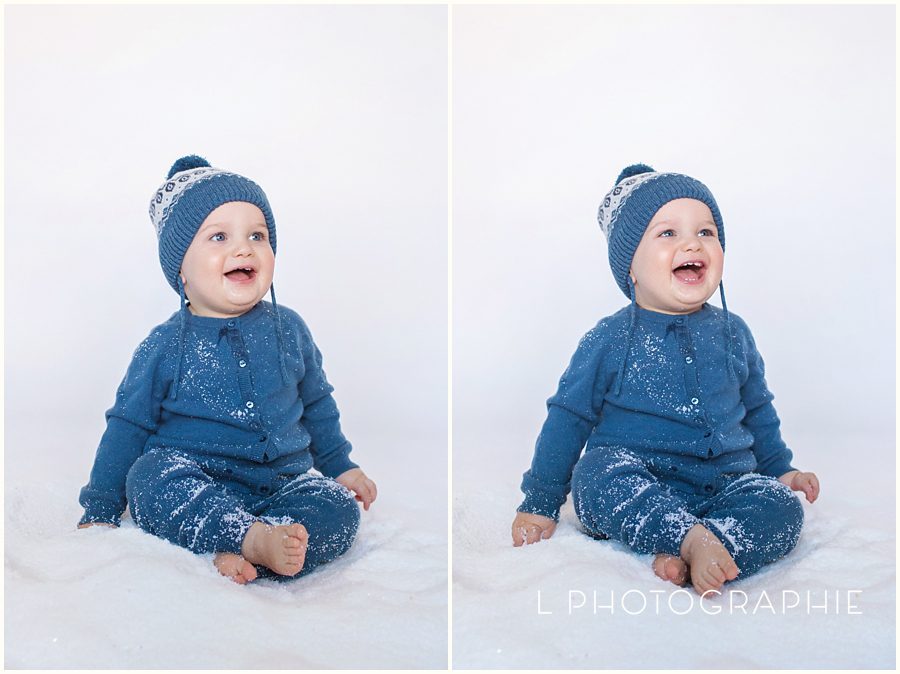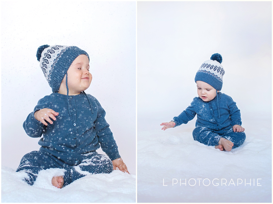 Well. For this little guy’s 1st Birthday celebration Mom was wanting snowy-wintery photos to celebrate the season of his Birthday. Photos that she could bring out and display every winter. Now, since it was 70+ degrees multiple times in February, we decided to create our own snow in studio! We used this fluffy stuff from Amazon (multiple packages) to create a warm winter wonderland. It was the perfect little pile of fun, and to be honest was not that big of a deal to clean up! I thought we’d have snow flakes appear between the studio wood floors all year. LOL. >> which is actually what Liz does to us with glitter around here ; /